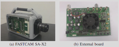 (b)参与开发了世界最先进的实时高速视觉平台Photron SA-X2。该相机可以以1024×1024@12000帧/秒的速度进行实时图像捕获及硬件图像处理,是世界上最快速的实时面阵高速相机,如图24所示。本团队主要负责实时硬件图像处理算法的设计及实现。掌握了追踪目标ROI快速更新技术(0.1 ms级别),开发了超高速运动目标追踪追踪系统(12000帧/秒)、掌握了实时模糊度计算(0.1 ms级别)技术、开发了复杂背景下的超高速目标探测及识别系统(12000帧/秒)等,如图1所示,为本项目的实施奠定良好基础。